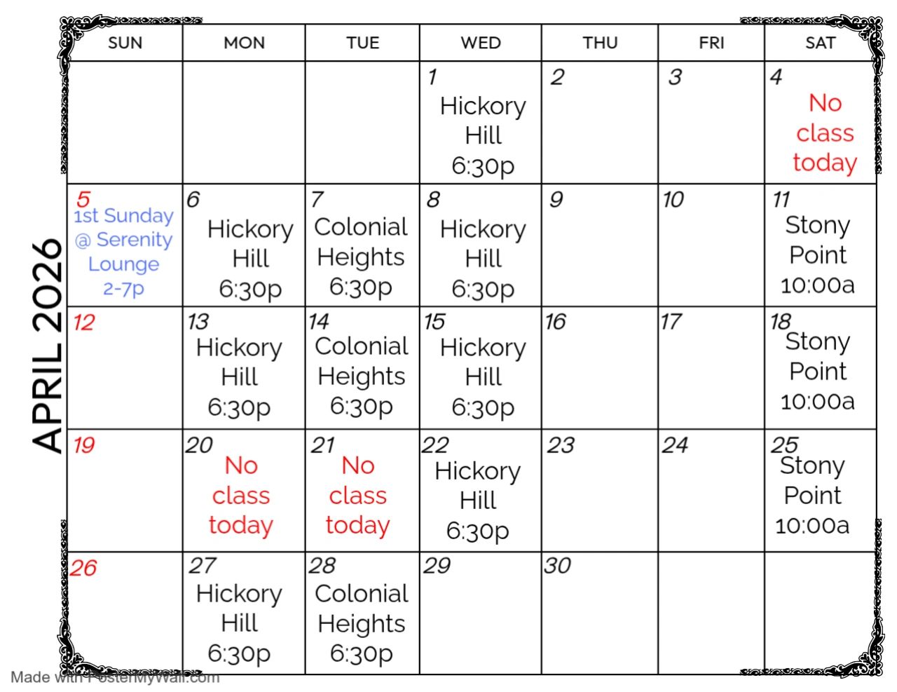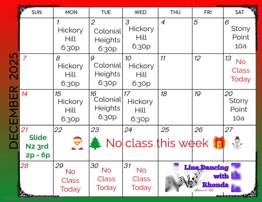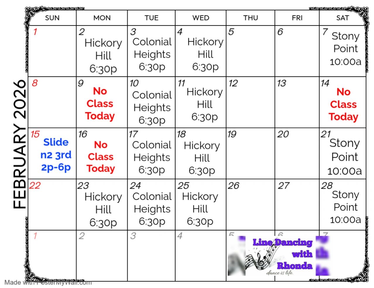 Please follow Line Dancing with Rhonda Facebook page for up-to-date schedule.
